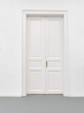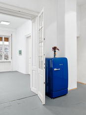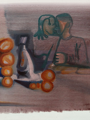 The largest painting in the exhibition is based on a scene of a woman bathing and a man getting out of a car and taking off his shoes. The composition is linked to the rest of the series by an unexpected, conceptual painterly gesture: a hand washing dishes, reminiscent of a Malevich Suprematist composition, transports the viewer back to the kitchen. The closing image thus appears as a concluding, yet thought-provoking act of cooking and being together.